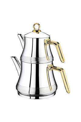 8075-G ( M ) 4 Parça, İndüksiyonlu, 1.Sınıf Paslanmaz Çelik Çaydanlık Gümüş Renk Gövde, Gold Renk Detay