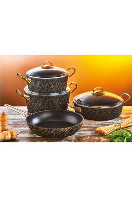 AVANGARDE - 3036 - 7 Parça - Bio Granit -Tencere, Tava, Çeyiz Seti, Siyah Gold Çizgi - Gold Detay